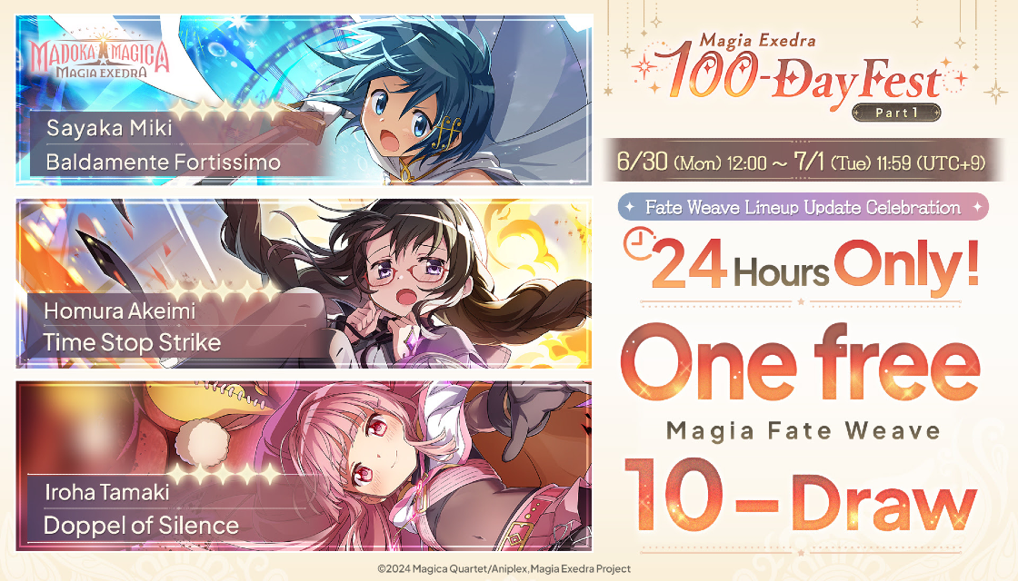Aniplex has unveiled exciting new in-game events for its popular magical girl RPG, Puella Magi Madoka Magica: Magia Exedra. Starting Monday, June 30th, at 12:00 JST, players will have a limited 24-hour window to claim a free Magia Fate Weave 10-draw. This special gacha will feature highly sought-after characters such as [Baldamente Fortissimo] Sayaka Miki and [Time Stop Strike] Homura Akemi. The game, a collaboration between developers Pokelabo, Inc. and f4samurai, Inc., with management by Pokelabo, Inc., continues to engage its player base with these generous offerings.